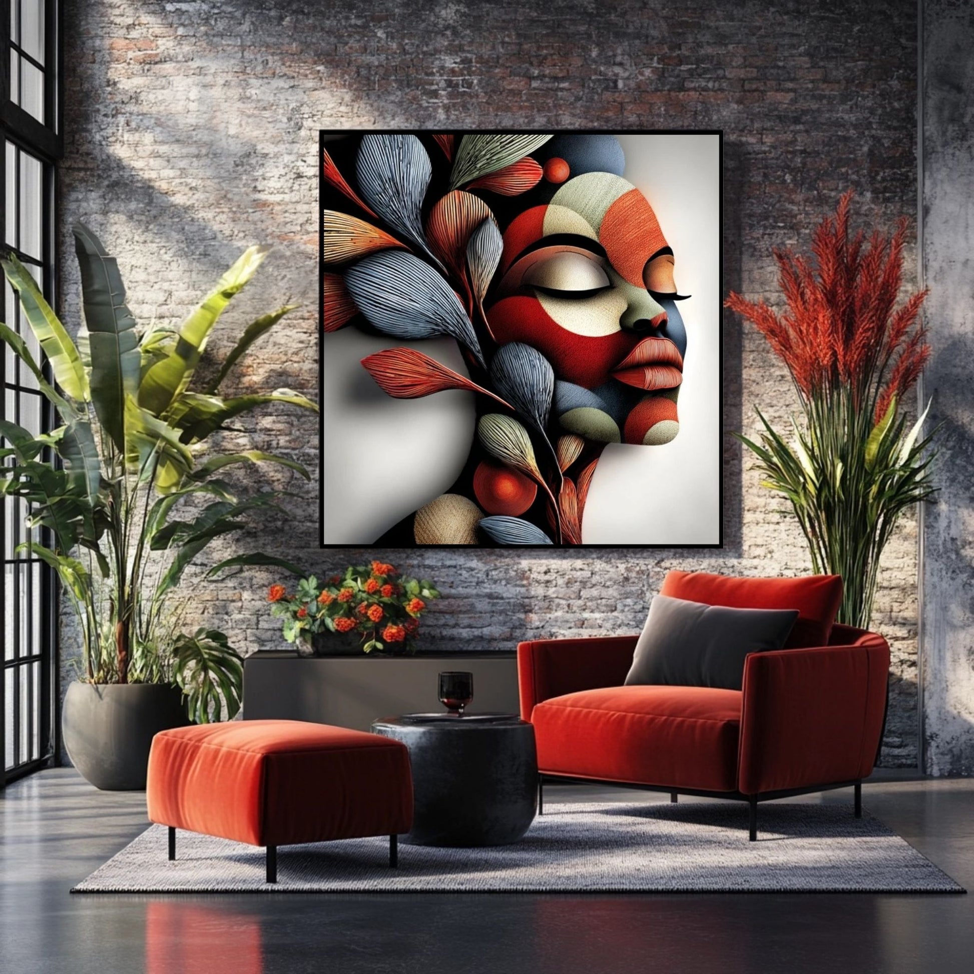 Circles of Becoming features a serene female profile formed through layered circular shapes and flowing textured elements. Earthy reds, soft neutrals, and muted blues move across her face with calm intention, symbolizing wholeness, reflection, and self awareness.