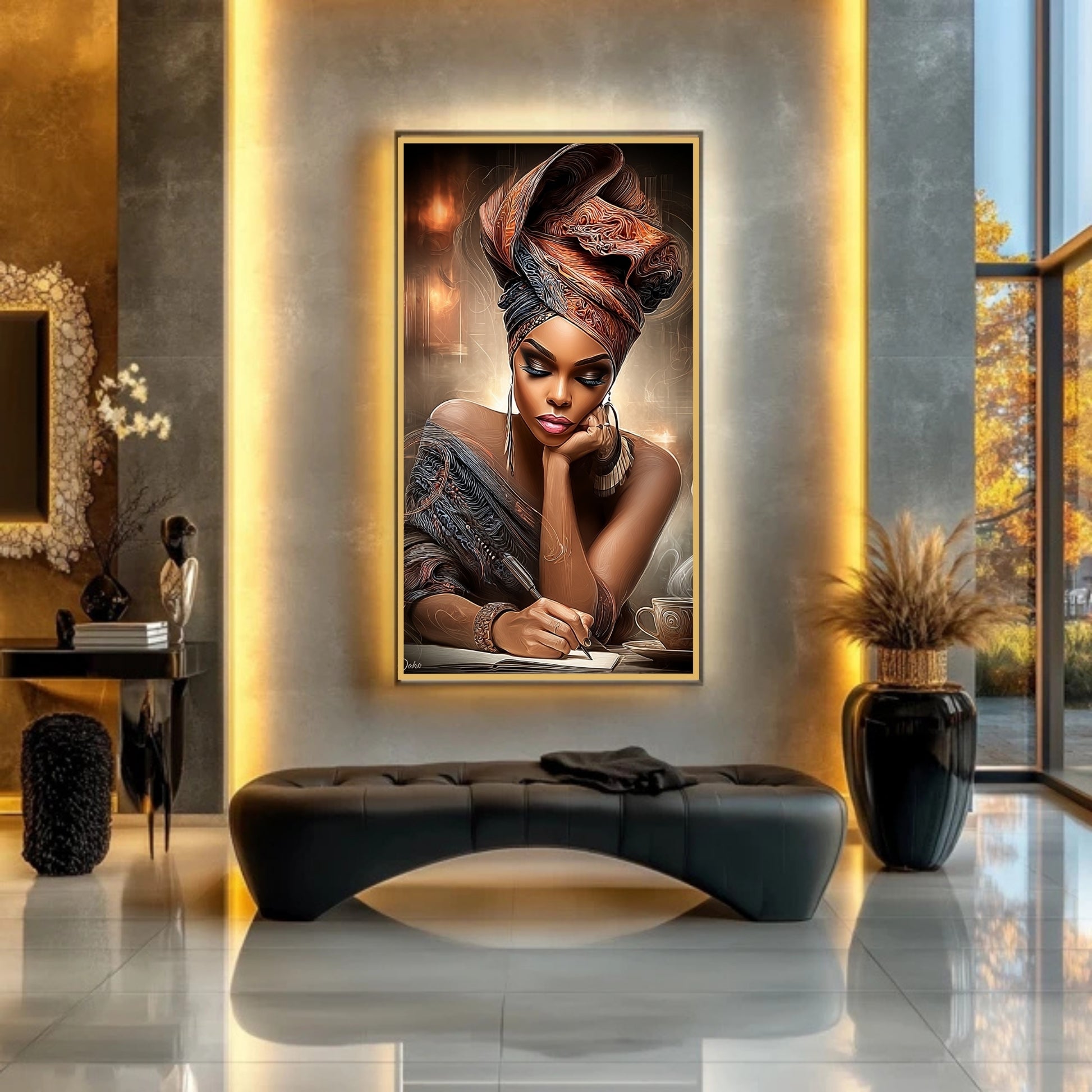 Ink of Intention portrays a serene Afro inspired woman lost in her writing, surrounded by warm light, textured fabrics, and the soft swirl of rising steam. Her expressive eyes, sculptural head wrap, and grounded energy create a soulful statement piece that celebrates the power of a woman with a vision.